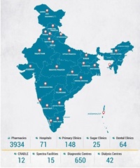 Apollo Hospitals operates 71 hospitals (10,261 beds), 237 outpatient clinics, 3,766 retail pharmacies, a telehealth network covering 125 sites, and several medical educational institutions (Figure 2). Patients mostly come from middle- and upper-class segments with a mix of private pay (about half), insurance, government schemes, and international patients.